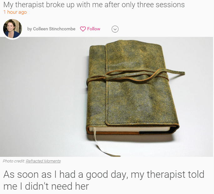 I wrote this: “I picked my therapist because she identified as feminist. She had experience dealing with anxiety. She was less than a 20-minute drive from my house. It took a week of waiting after that to finally get to see her.”