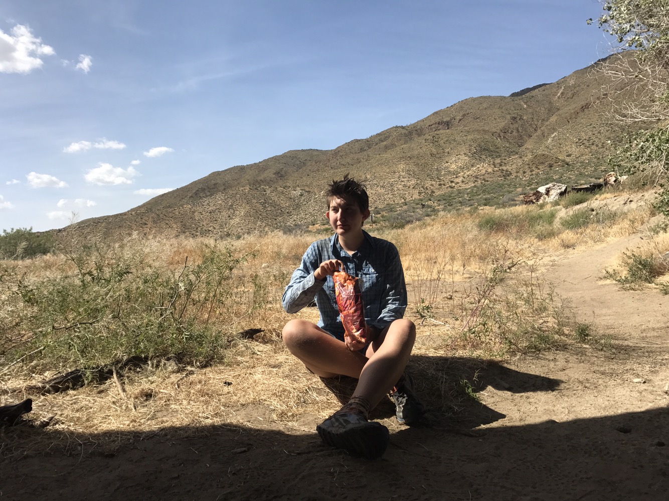 An hour or so later the group came down to join me. We ate fresh fruit and I drank tea and decaf coffee. My brother called so went back to the room and chatted with him for a little while. Then all of us slowly got our things together and checked out. Karma and I ate the leftover food we hadn’t finished from last night after hearing it up in the hotel’s microwave. Karma went looking for a postcard and I went hunting for the rest of my resupply, enough to last me 2.5 days. I stopped by Carmen’s first and a hiker named Tarentino walked with me looking for his own resupply. The group made a plan to head down to Scissor’s Crossing early to hang out by the water cache until the sun was less intense and try to do around 8 miles, but then Twerk decided to stay in Julian until a little later.