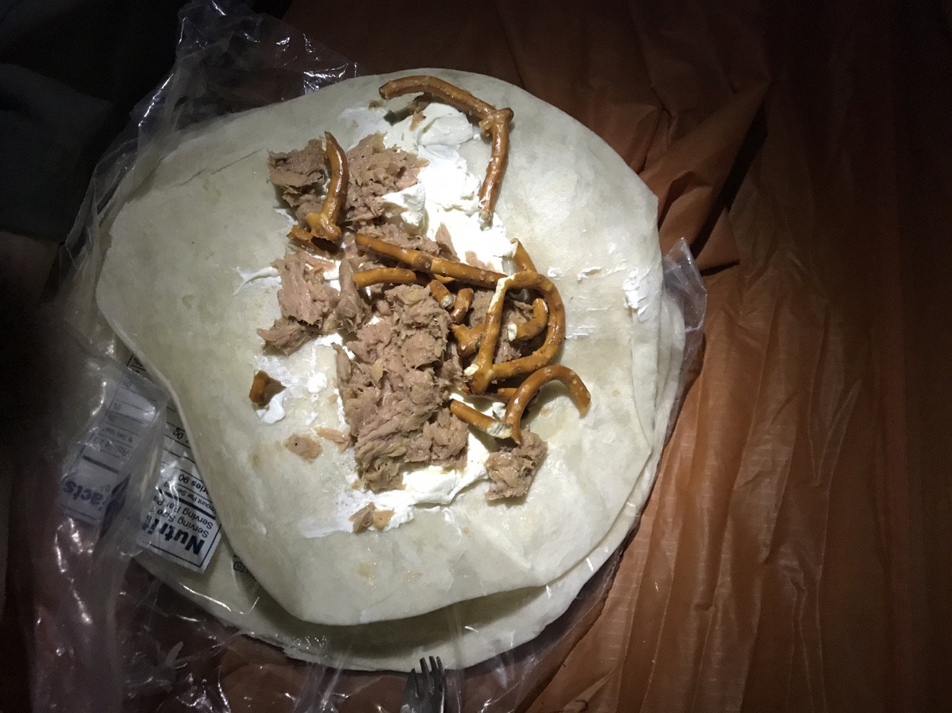 We wanted to eat hot food but the wind was blowing pretty rough so we ate in our tents instead. I had a tortilla with cream cheese, a tuna packet and pretzels, and afterward a snickers.