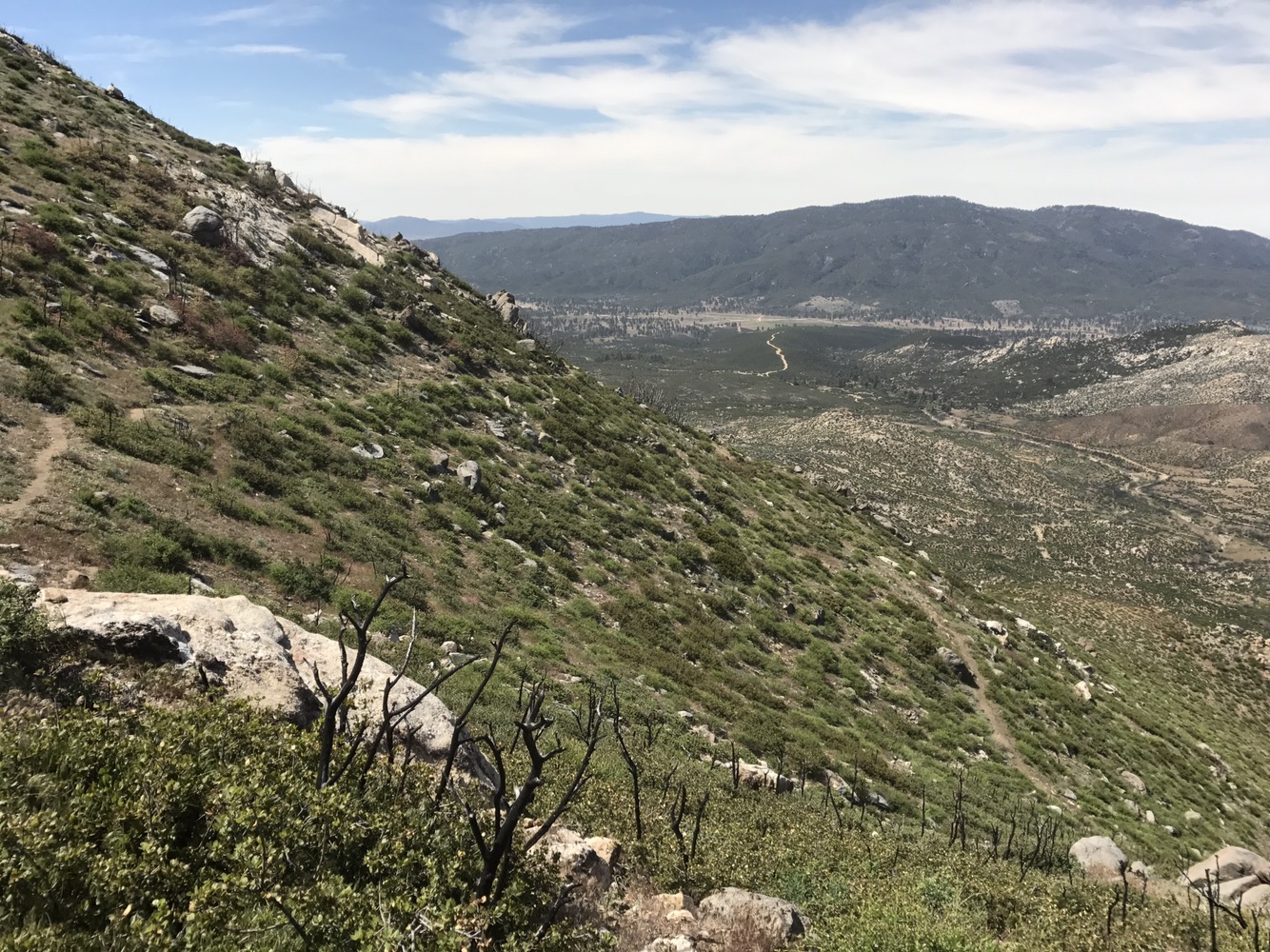 I descend down, down, down. At the intersection for the alternate I run into a woman with an empty backpacking pack. She’s been out here since April 11 and had gone off trail to tend to her blisters, as well as meet up with her husband who meets her in their trailer every week or so. We chat our way down the mountain and eventually I stop in the shade and she continues.