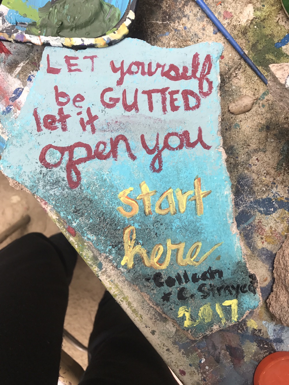 I get myself some coffee and pancake, which are delicious, but coffee is a mistake and my body shakes for the rest of the morning. I call my family to check in. I paint myself a rock with a Cheryl Strayed quote on it and put it where I camped and then pack all my things. Rawhide is packed too, and Twerk, and we decide to eat at the cafe again before leaving. I rinse my clothes real quick and hang them up to dry and leave my pack behind.