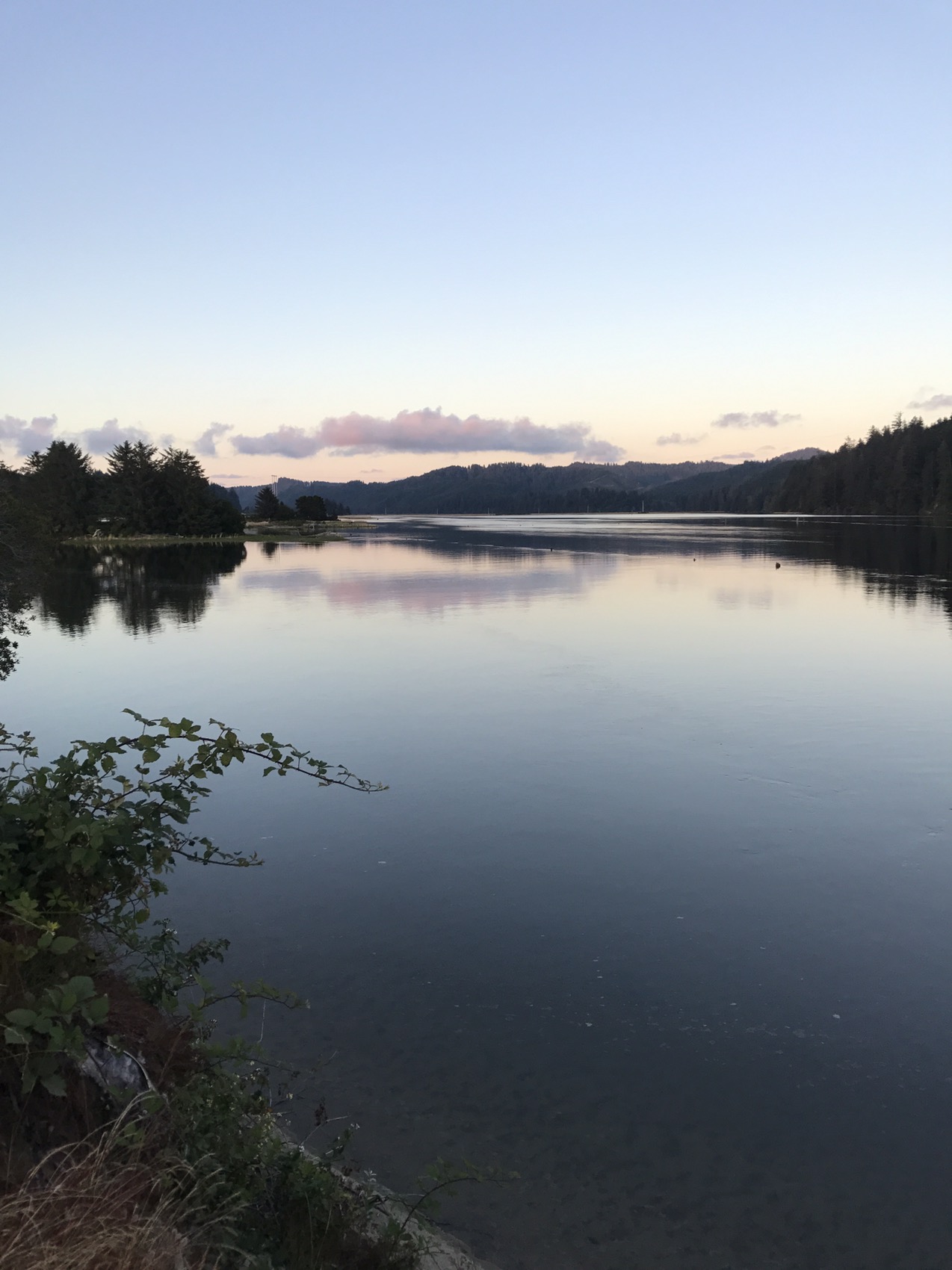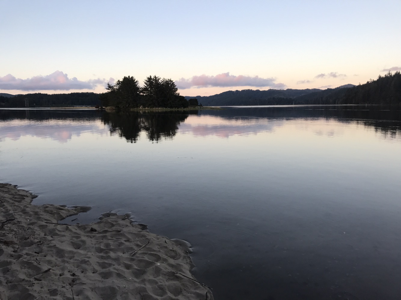 Just before dark, I go to the bathroom and start walking toward my tent. But then I notice the sunset over the water and start exploring a little, and I come upon a little sandy area with a gorgeous view and I just sit there and take it in. It is nice to be somewhere beautiful, by myself, with nowhere in particular to be.