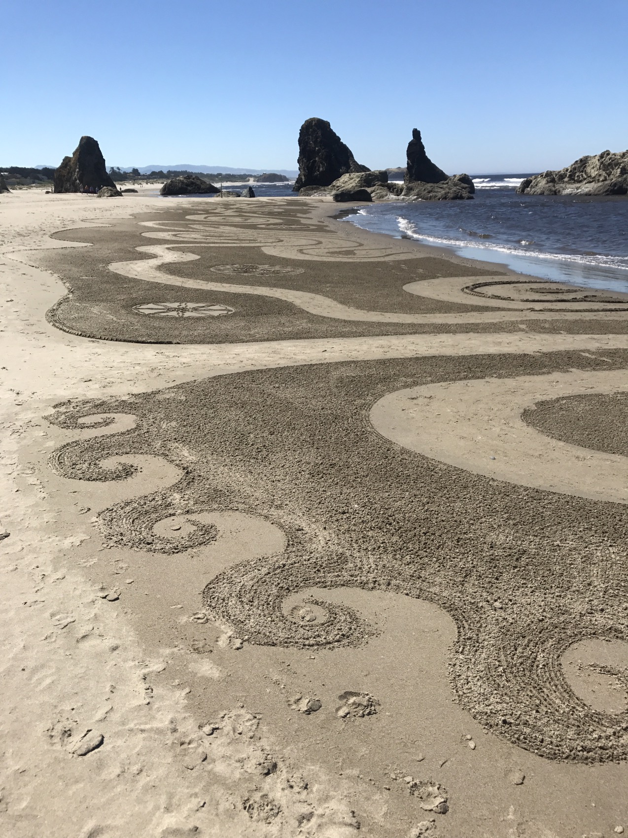 Bandon is awesome. There are awesome rocks and cool sand art and it’s just an overall pleasant walk. We walk a few miles and then we’re tired and we have to wait for low tide, so I set up my tent and take a nap. Genius. Dexter wraps herself in Tyvek and sleeps, too, and Energizer Bunny updates Facebook and basks in the sun.