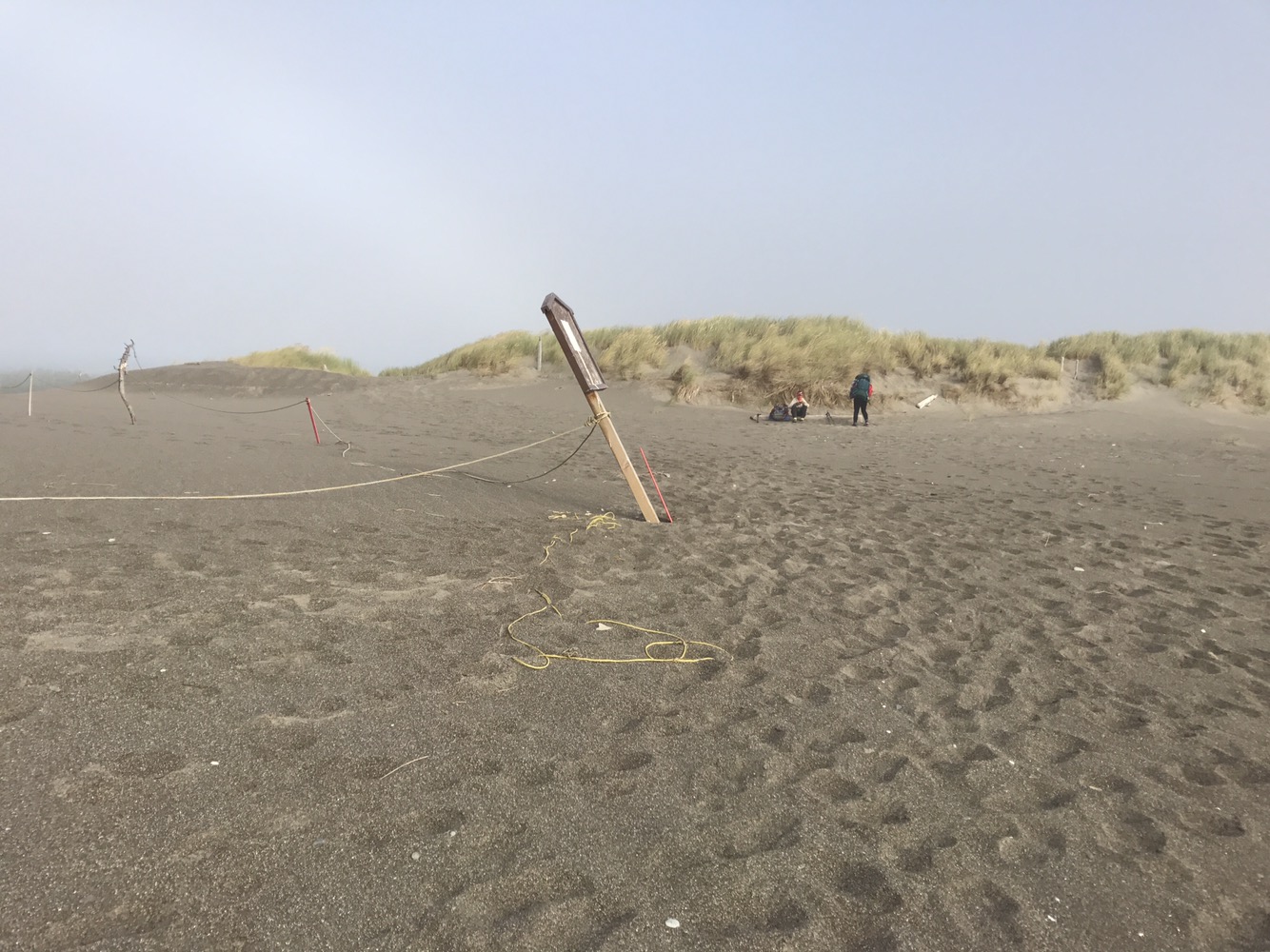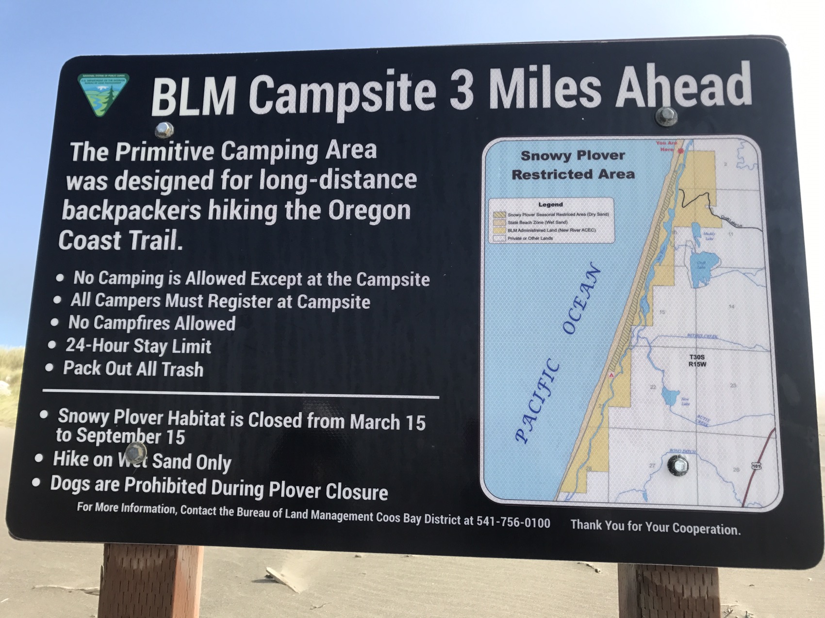We get moving. A fog rolls in and the sand keeps going and going. We’re walking on slightly softer sand because the firm sand is slanted steeply. We probably would have stopped earlier, but this is Snowy Plover territory, a type of bird that nests in the sand. There is only one camping area that we’re legally allowed to camp in and it’s a little mysterious and hard to find. A sign tells us it’s three miles away but there’s no real way to track miles and it’s hard to estimate when the sand is as tedious and slow as it is.