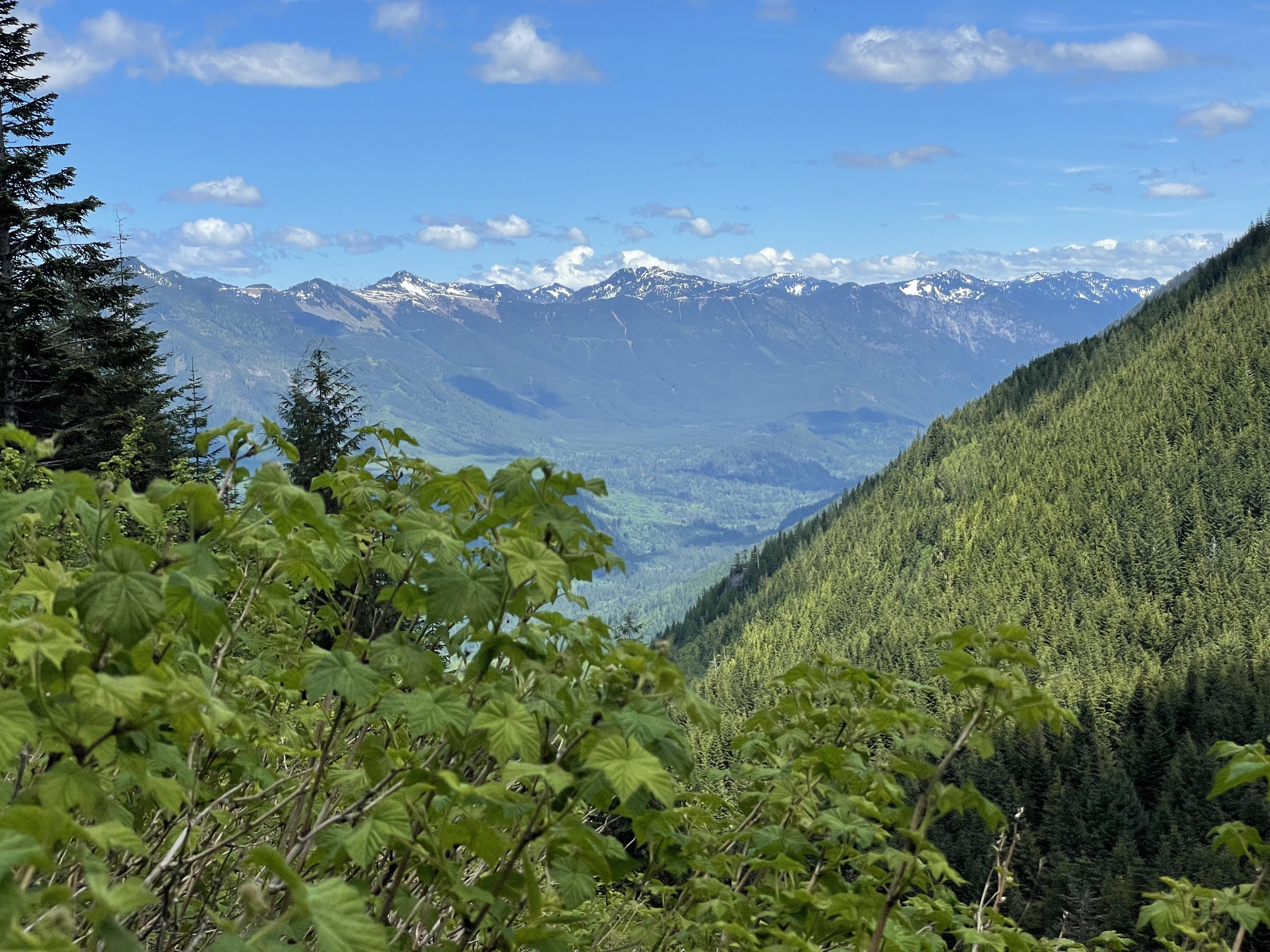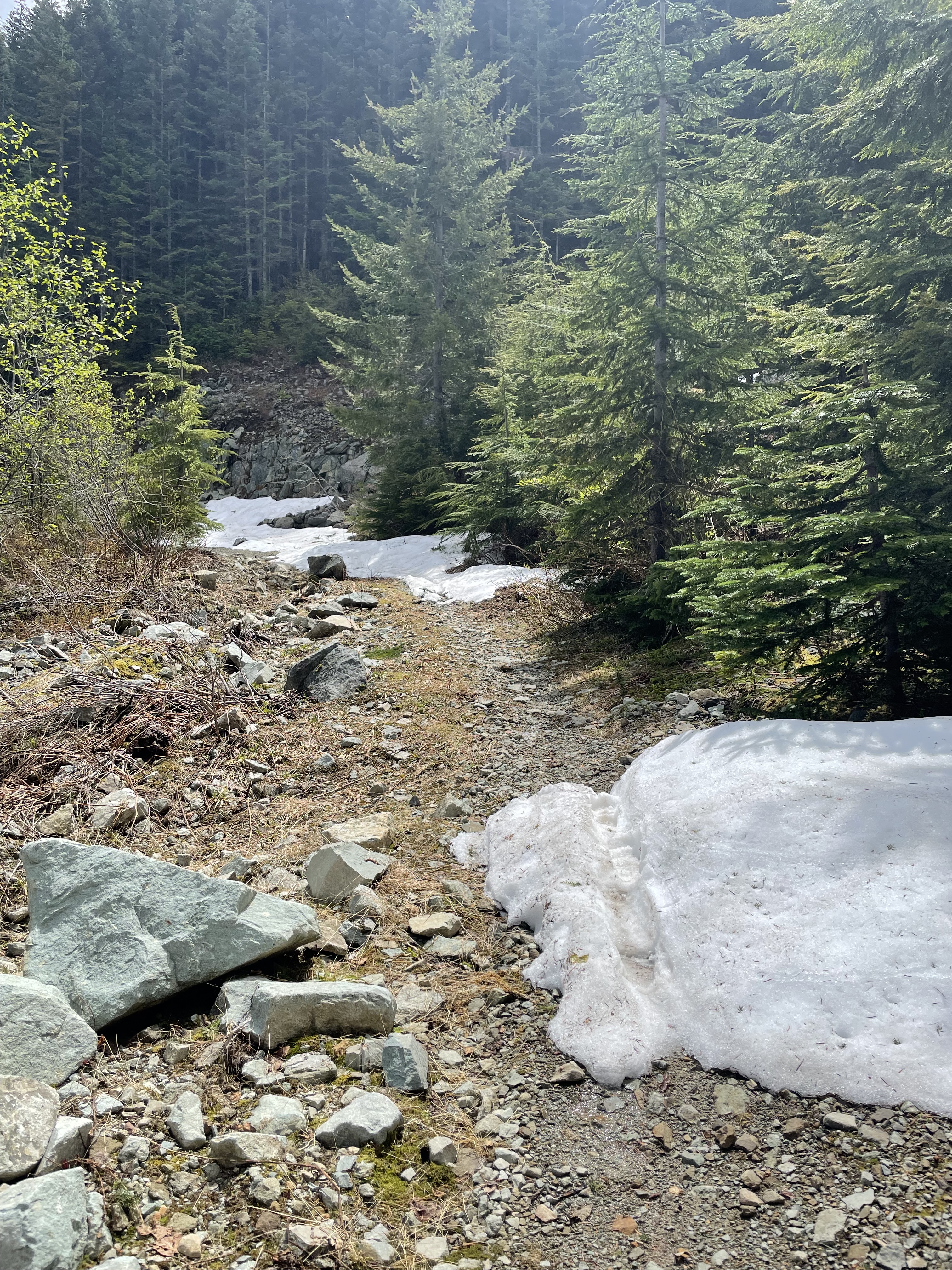 This week’s run was the same trail as last week’s, for simplicity’s sake. (It’s not that easy to find 20+ mile trails that have the right elevation gain and no snow right now.) The Palouse to Cascades Trail is uphill from the trailhead but super super gradual. I try to jog parts of it, but the more I try, the more my stomach sloshes. Forget it. I’ll just walk. And walk I do, at a decent clip, turning off onto the Ollalie Trail and starting to go up in earnest. The good weather means the mountain bikers are more plentiful today, and I mostly leave my headphones out so I can hear the whoosh of them coming down the trail.
