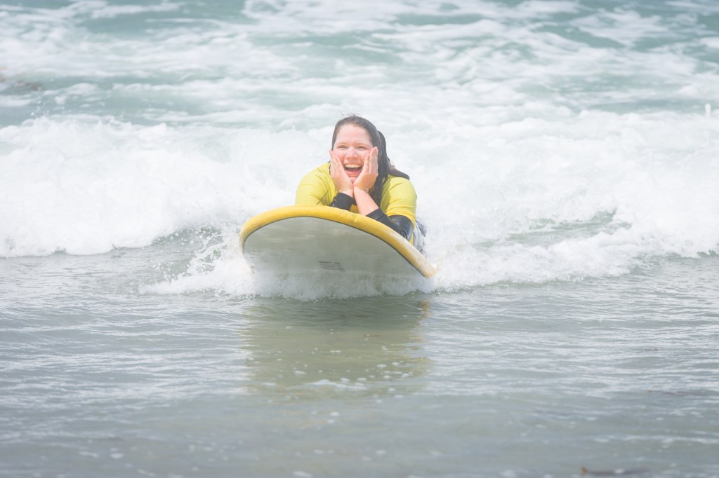 Wednesday we surf again, and this time I am sore but primarily fatigued. The instructor is less hands-on and it’s harder to get on the board and my wetsuit is looser so I keep ending up with water trapped in water balloon-like pockets in my ankles and arms. But I hired a photographer to take photos of me and my friend so we persist. I stand a few times for a few seconds. I think I love surfing?
