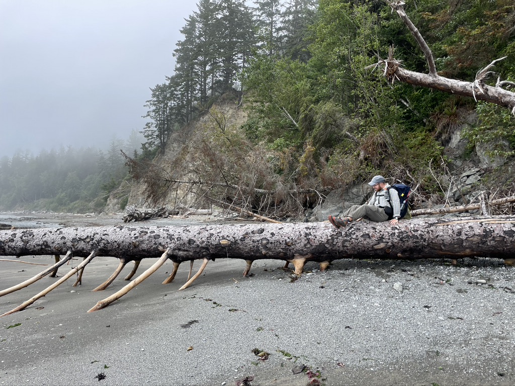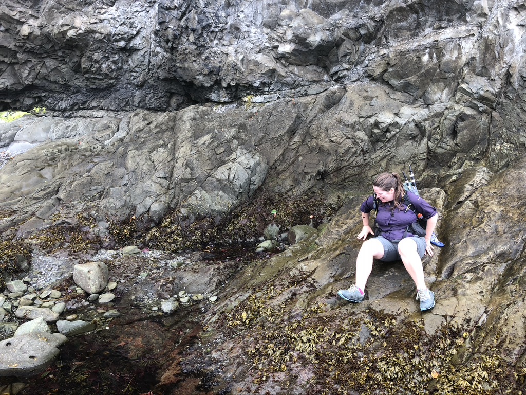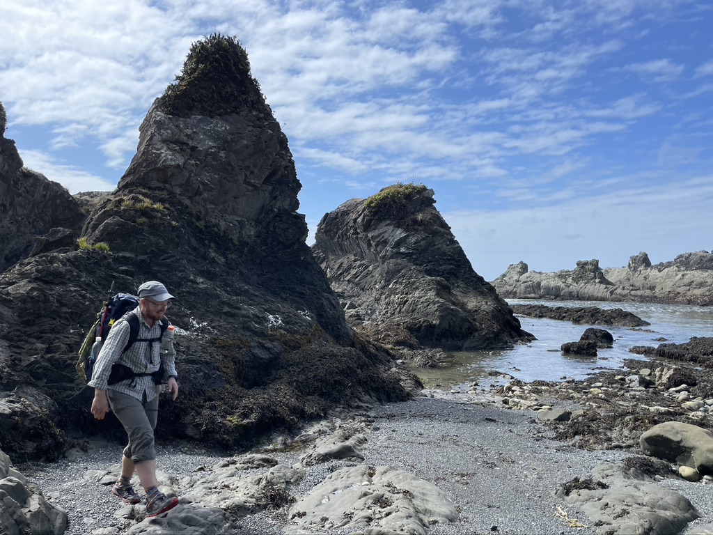 We continue, climbing over and under downed trees (“blowdown!” we joke each time we see them, because Toby encountered so many blowdowns on his PNT hike) and trudging through pebbles and spring-mix colored seaweed that smells like rotting ocean. Another couple of backpackers. One of them is smoking a cigarette. They say they’re doing an out and back, heading out now. They carried a gallon of water. They’d rounded the cape yesterday at high tide. They look beat, but we don’t have a gallon of water in our pack, and we don’t have to cross at high tide, so we don’t take their exhaustion too seriously. We commiserate and then continue. At least it’s not high tide! We think.