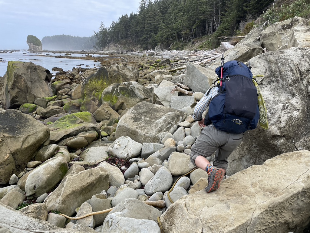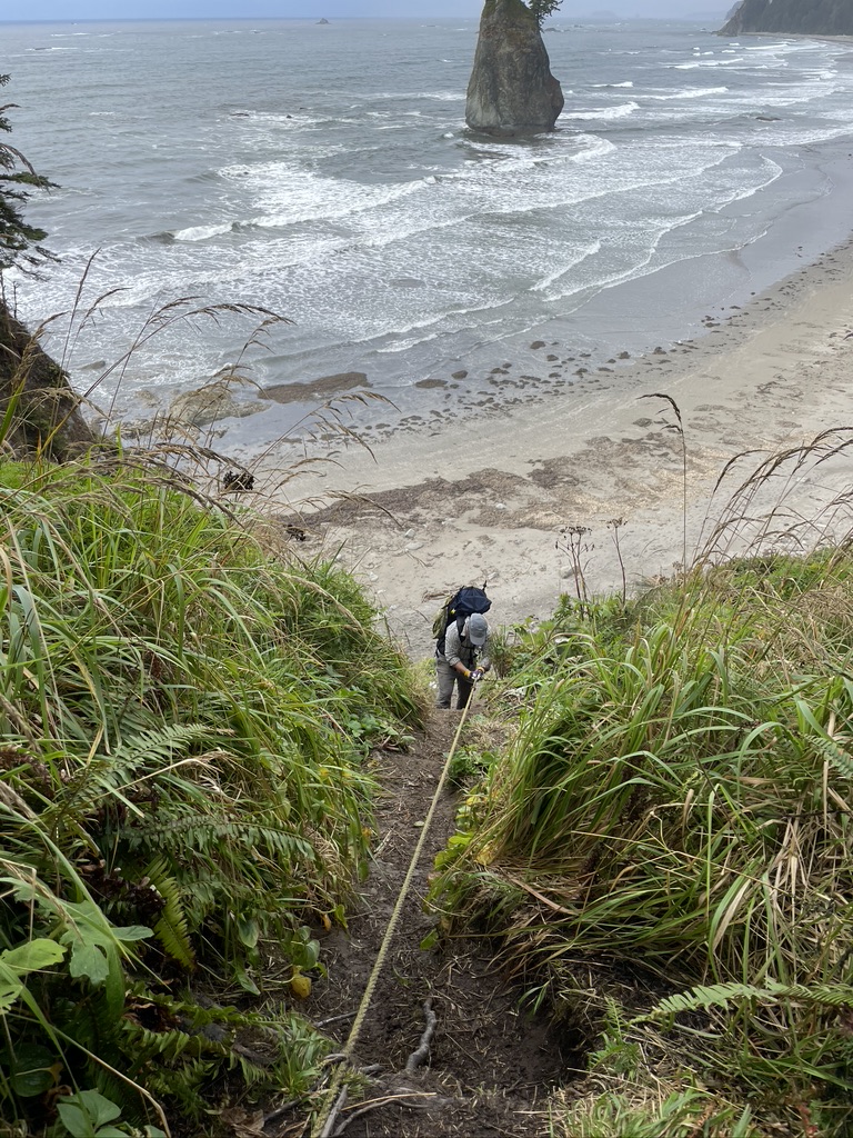 After some more rocks, we reach a grey beach with compact sand, and our feet feel like new feet. We’re flying. Camp still feels so far away, but at least we’re moving. Only minutes pass before we get to our next challenge of the trail: our first overland crossing. A thick rope dangles from a 30-foot arm made of dirt and sand, and Toby goes first ascending. At the top, just as I am finding my footing and trying not to let myself panic, Toby yells out, “you’re going to be so happy to get up here!”