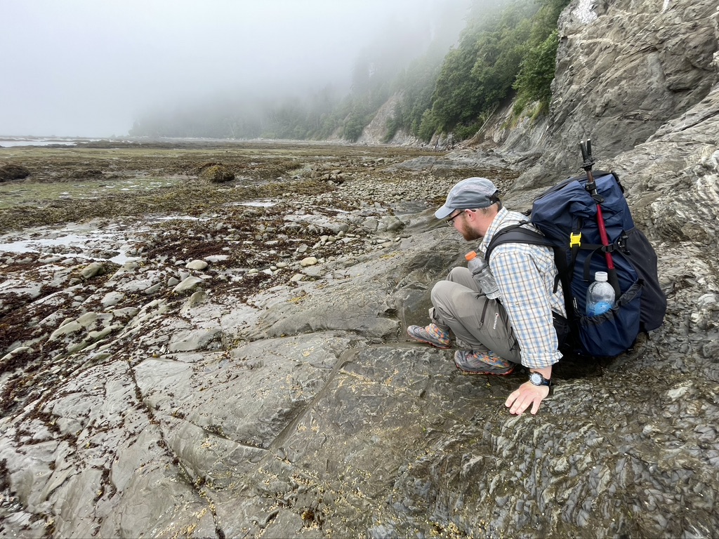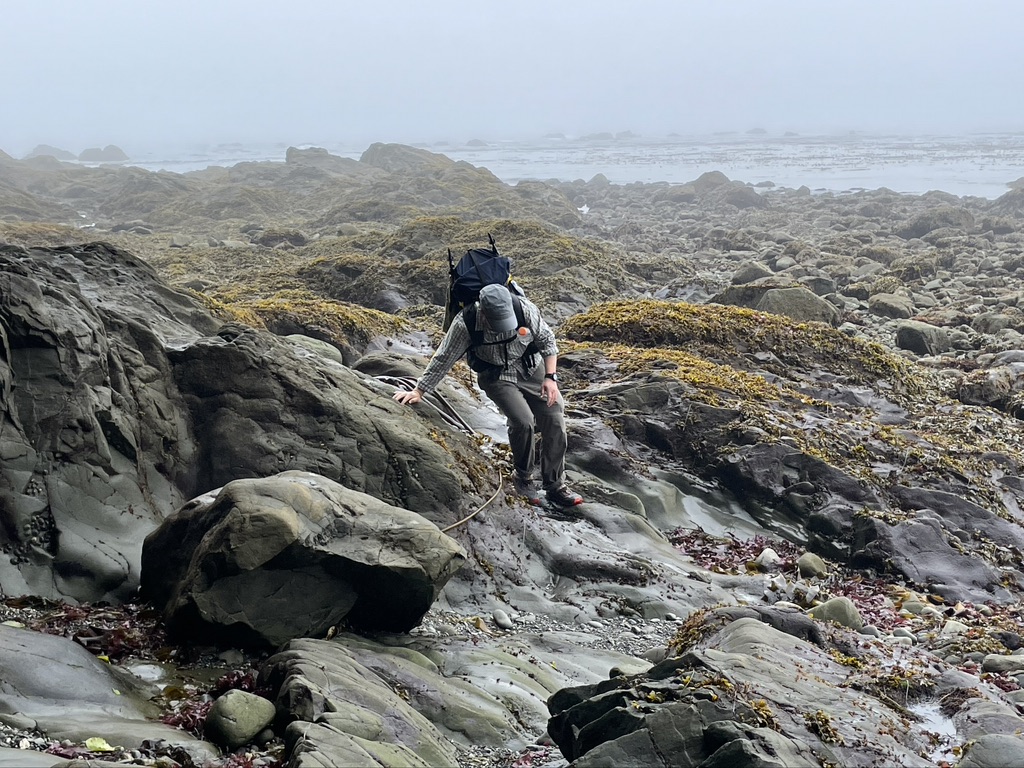 In fact, we’ve planned tide perfectly — we head around Cape Johnson at exactly low tide. Despite that, we quickly realize this cape is not fucking around. Yes, it is covered in boulders that you have to climb up, around, sometimes leading to dead-ends or cliff-outs where you have to descend again and reroute. But now, in addition to being big and sometimes unstable, the boulders are slick. Even when you find a stable rock, there is no solid footing.