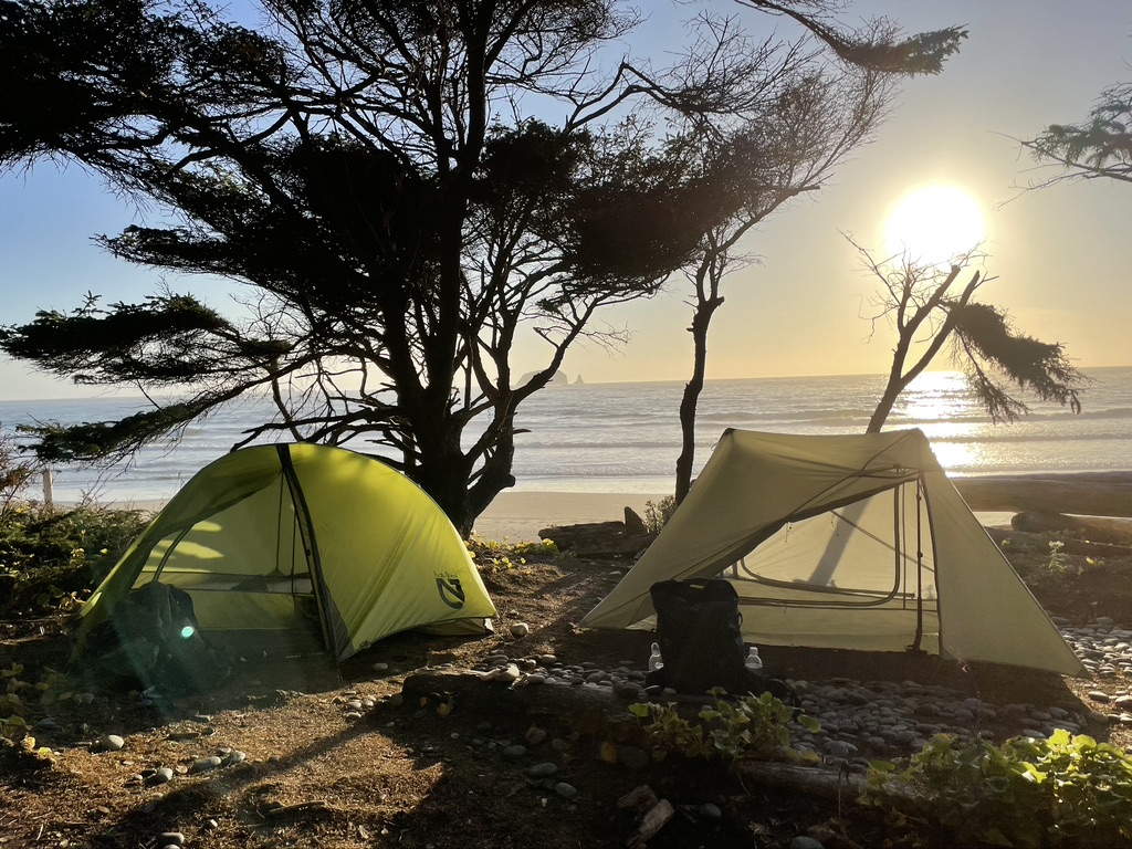 We keep looking around and considered a site on the other side of their rock, then the other side of their tree, when the man in the couple comes up to us and says he found a good spot for us. Toby is skeptical but I go look, and it was genuinely cute – tucked behind a big driftwood log and with its own wooden wind chimes.
