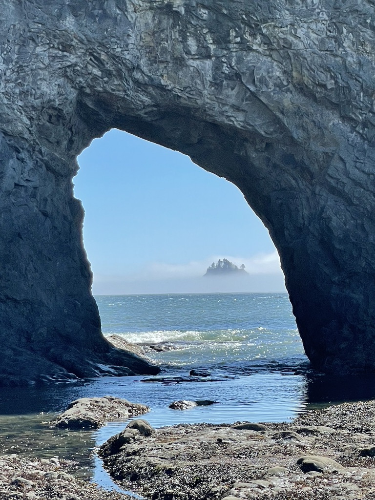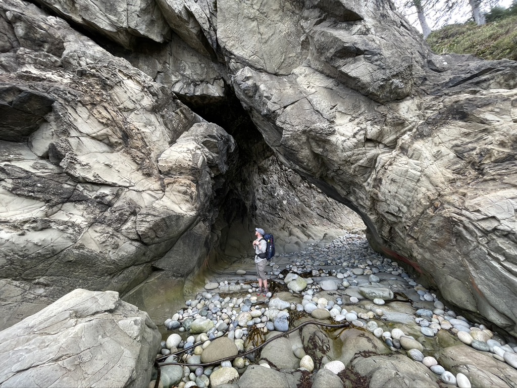 One stretch of boulder-scurrying is short, but the last section is still flooded with tidal water, and our only option is to wade through shin-deep pools. Our feet are wet, but who cares? It’s no Cape Johnson. We climb over and duck under blowdowns. We meet large caves carved by waves, which I keep calling “coves”—any inward protrusion is a cove, my brain decides, although we learn later that’s not the real definition—and take pictures, feeling small within them.