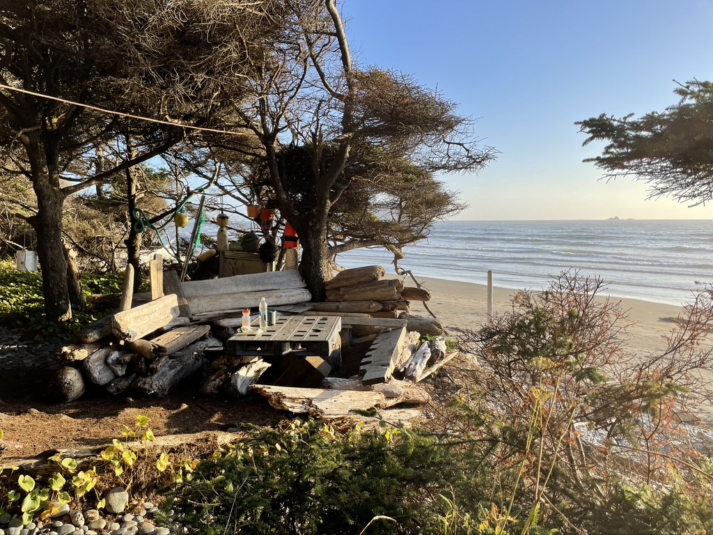 Then we look for camp, and luck upon the cutest little spot tucked into the trees just above the beach. One campsite over looks the ocean, and just south of it is a a little breakfast nook made out of driftwood, complete with a marine-debris table, all looking out over the water. We’ve made it. We survived Cape Johnson.