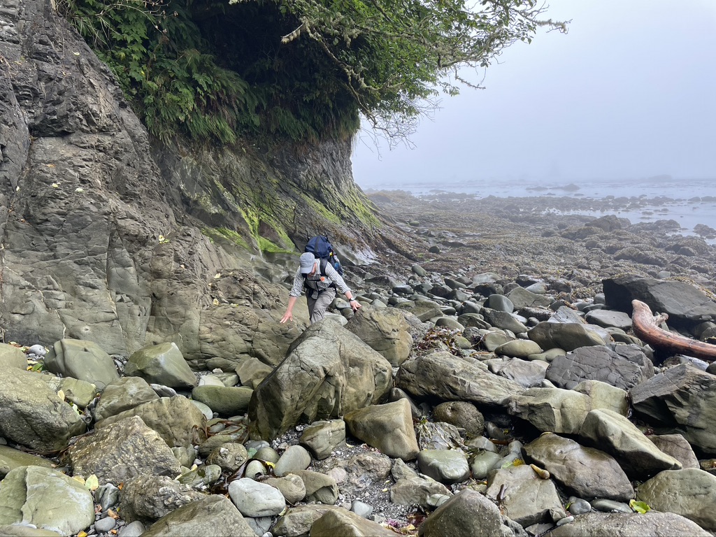 Then the boulders end and it’s back to a pebble beach, a large cape ahead. Cape Johnson. We cross paths with another backpacker who’s come from the opposite direction. He has a British – possibly Australian – accent. Toby asks if he has any intel for the trail ahead. “Buckle up,” he says. It took him about an hour and a half to get around the cape.
